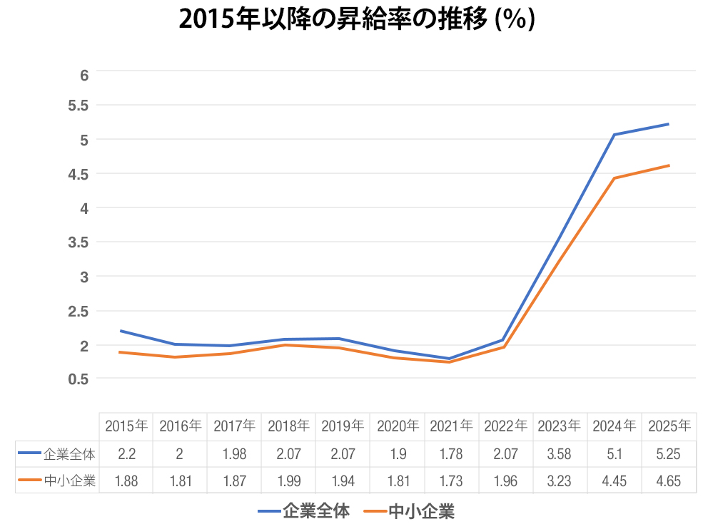 年度 企業全体 中小企業 2015年 2.2% 1.88% 2016年 2% 1.81% 2017年 1.98% 1.87% 2018年 2.07% 1.99% 2019年 2.07% 1.94% 2020年 1.9% 1.81% 2021年 1.78% 1.73% 2022年 2.07% 1.96% 2023年 3.58% 3.23% 2024年 5.1% 4.45% 2025年 5.25% 4.65%