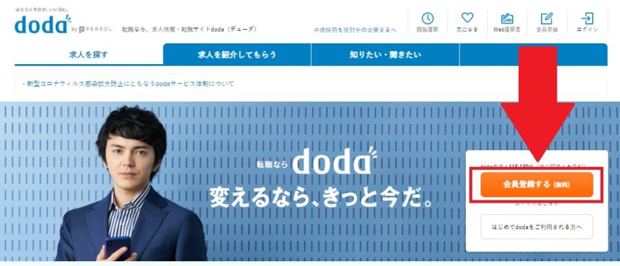 まずはdoda公式サイトにアクセスし、サイトトップ画面の「会員登録する(無料)」をクリックしよう。