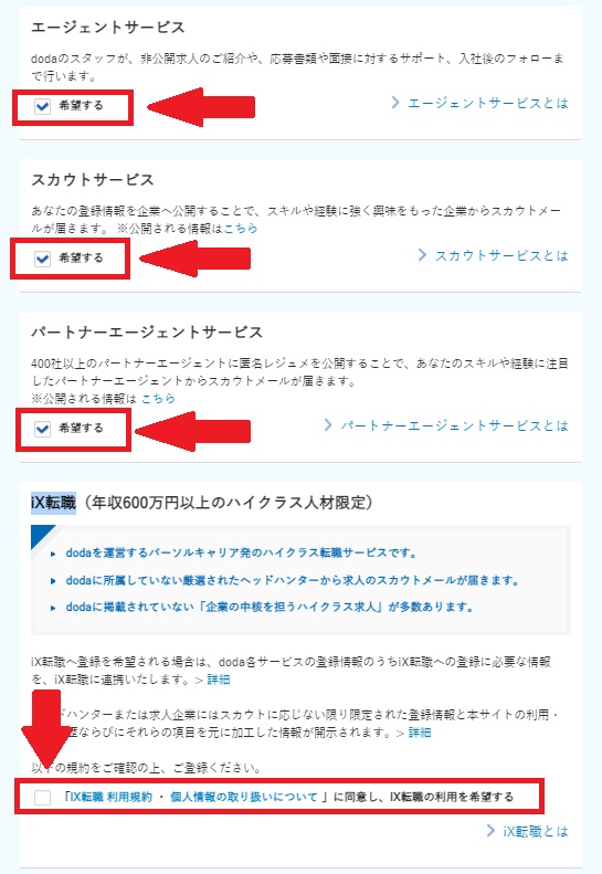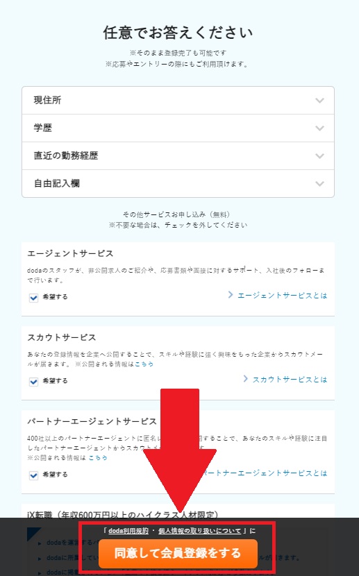 また先述した「エージェントサービス」「スカウトサービス」「パートナーエージェントサービス」への登録を希望するか選択できる。希望しない場合はチェックボックスからチェックを外して会員登録しよう。