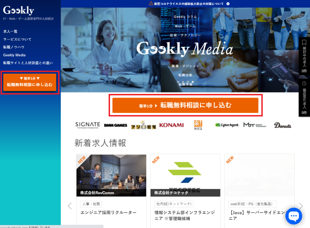 まずはギークリーの公式ホームページにアクセスしよう。ページの中心、左側に「転職無料相談に申し込む」というボタンが表示されているので、いずれかのボタンをクリックする。