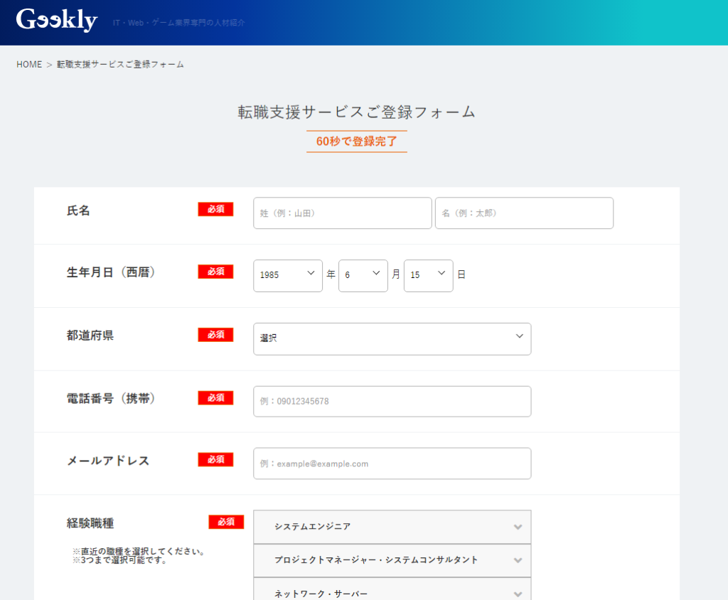 ギークリーの登録は数分程で完了できる。登録情報は最小限で済むため、仕事で忙しい方でも簡単に登録可能だ。希望条件・詳細な経歴の確認は、登録後の面談・メッセージのやり取りで実施される。登録の段階で審査されることはないので安心して欲しい。