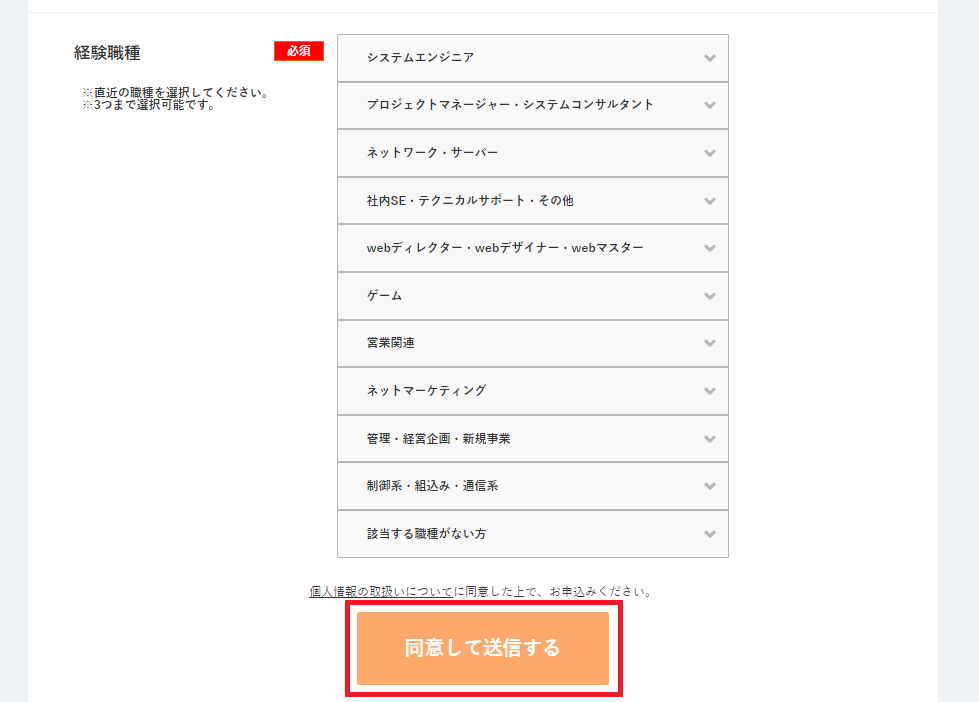 すると基本情報の入力画面が表示される。各項目の入力・選択を進めていこう。入力・選択が完了したら、「同意して送信する」をクリックする。