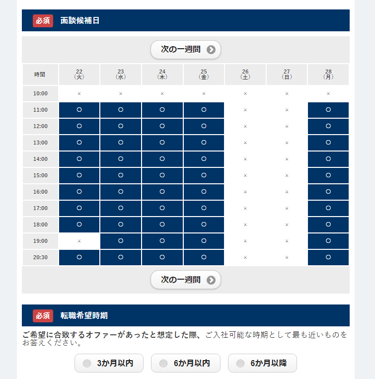 面談希望日がすでに明確である場合は、登録完了後に表示されるカレンダーより登録が可能だ。転職希望時期の選択、補足事項・質問事項の入力も合わせて行える。選択・入力が完了したら、「候補日として登録する」をクリックしよう。