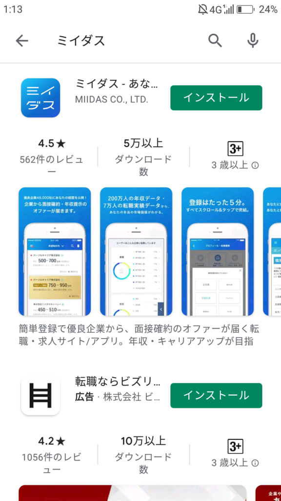 まずは、お使いのスマートフォンでミイダスのアプリをインストールする。アプリストアから「ミイダス」と検索すれば、最上部にアプリが表示されるので、インストールを進めていこう。