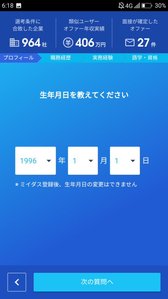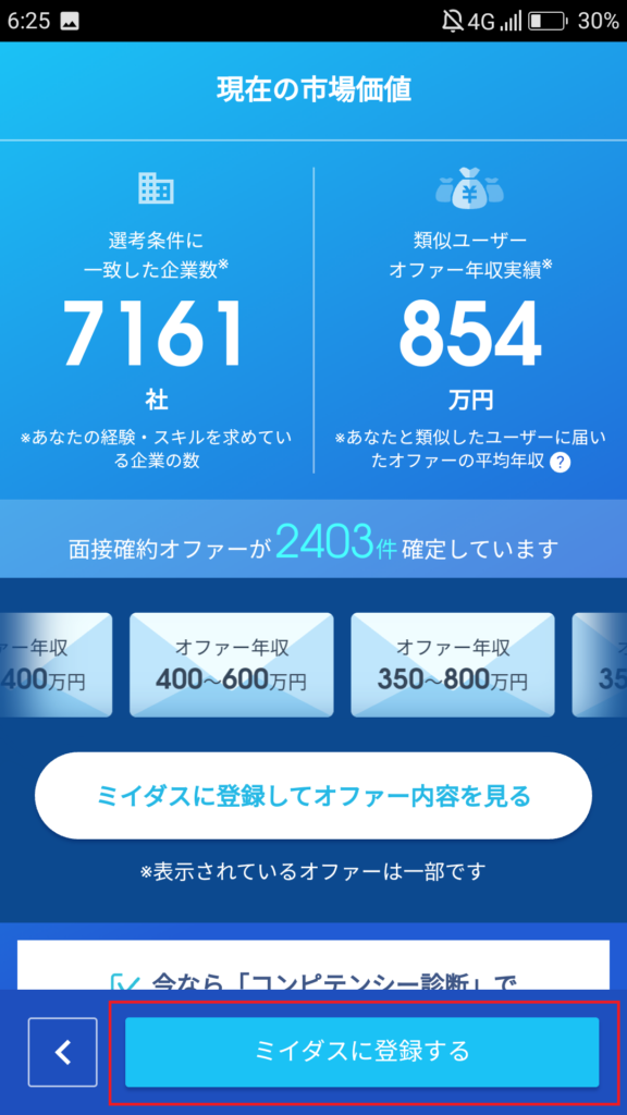 これでミイダスの登録は完了だ。登録完了の段階で、面接確約のオファーが表示されることもあるのでめー確認してみて欲しい。