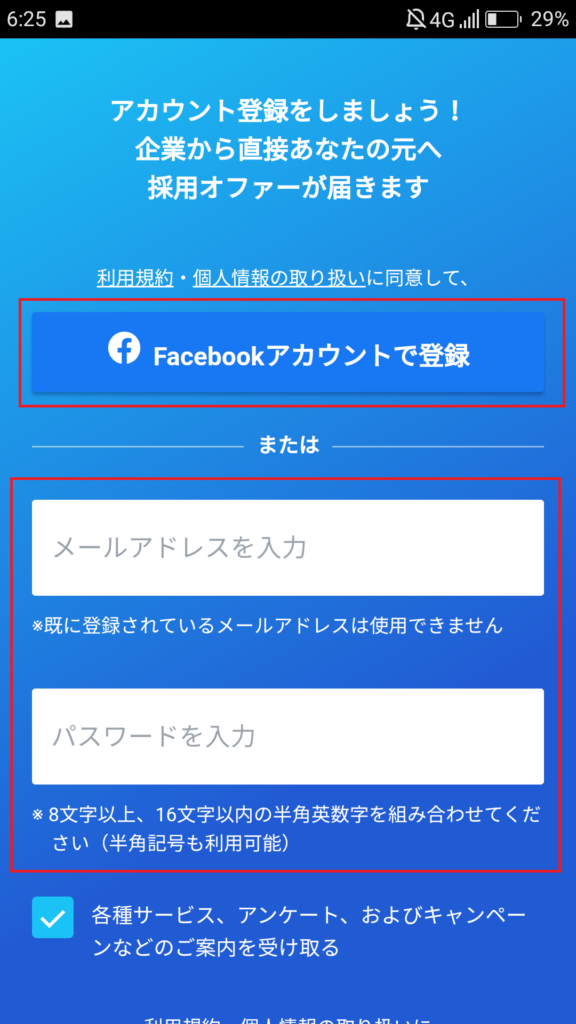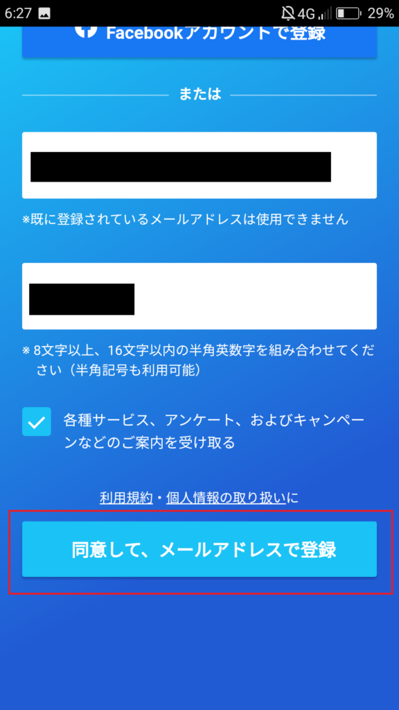 Facebookアカウント、もしくはメールアドレスで登録を進めていく。メールアドレスで登録する場合は、パスワードも設定していく。入力を完了したら、「同意して、メールアドレスで登録」をタップしよう。