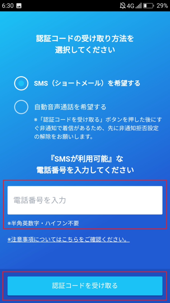 次に、認証コードの受け取りを行っていく。認証コードの受け取りでは「SMS」もしくは「自動音声通話」を選択可能だ。今回はSMSで認証コードを受け取っていく。入力欄にSMSが受信できる電話番号を入力しよう。