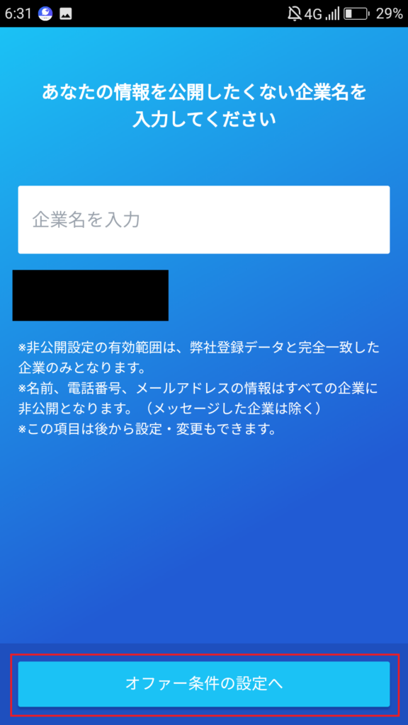 次に、自分の情報を公開したくない企業名を入力していく。現在就業している企業に、自分が転職活動を行っていることを伏せたい場合は、こちらに企業名を入力しておこう。入力を完了させたら、「オファー条件の設定へ」をタップする。