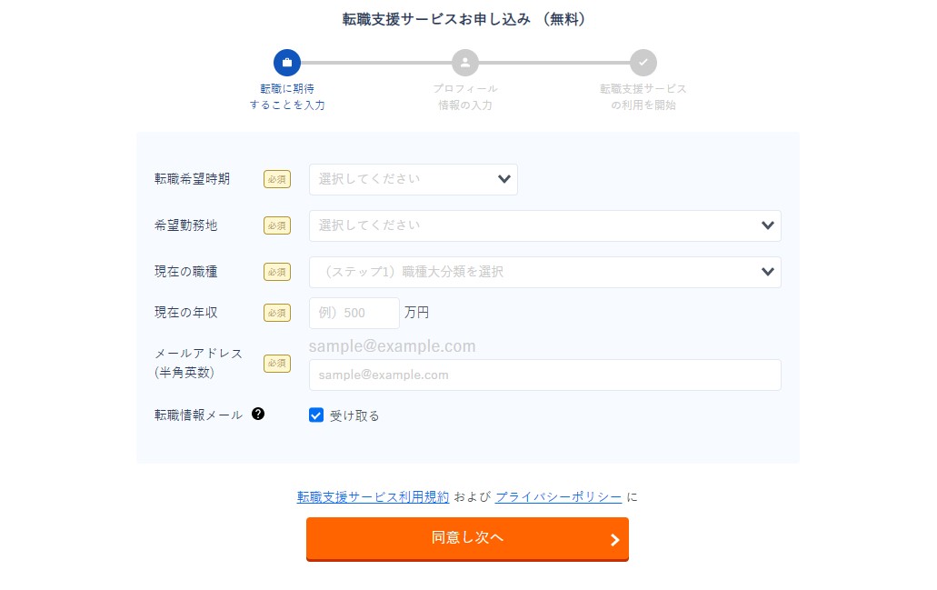 「現在の職種」を選択、「現在の年収」や「メールアドレス」を入力して「同意して次へ」のボタンをクリックしよう。