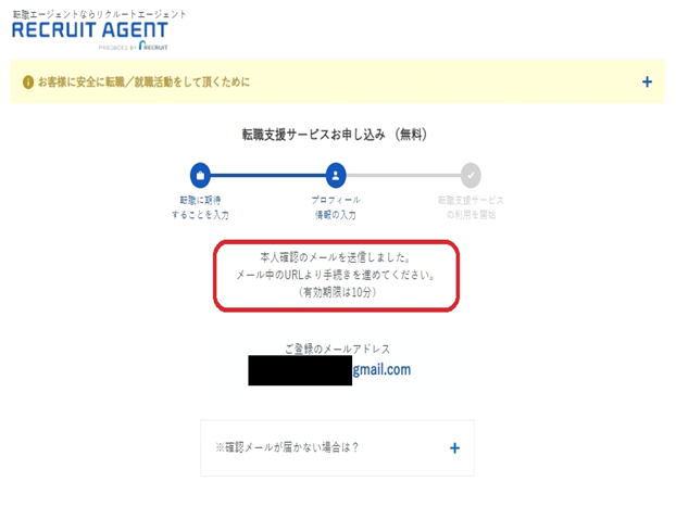 リクルートエージェントのサイトにも記載されているが、メール内のURLをクリックできる有効期限は10分なので、メールを受け取ったらすぐに作業を進めよう。