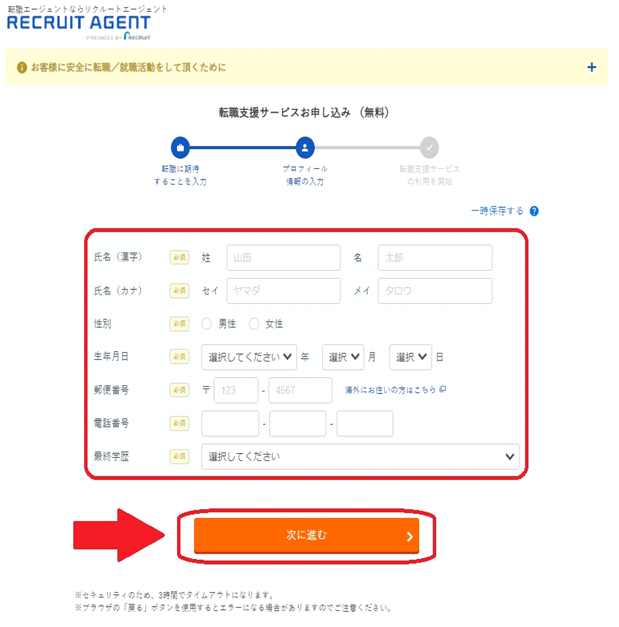 プロフィール情報の入力ページはセキュリティの都合上、3時間でタイムアウトになってしまうため、時間にゆとりのあるときに登録したほうがいいだろう。